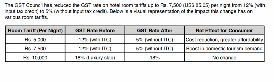 The 56th meeting of the GST Council, chaired by Union Finance and Corporate Affairs Minister Nirmala Sitharaman, has approved key changes in tax rates, including a reduction in Goods and Services Tax (GST) on hotel room tariffs priced at Rs. 7,500 or less per night. The GST has been brought down from 12% (with input tax credit) to 5% (without input tax credit), a move that the hospitality sector has described as a timely boost for domestic tourism and occupancies.